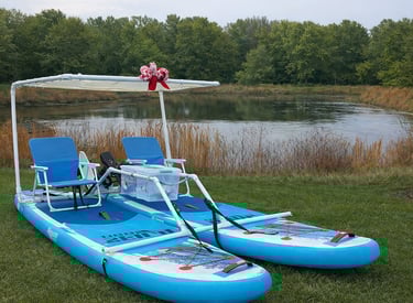 Float on 2 separate paddle-boards, 2 separate kayaks or a mini catamaran
